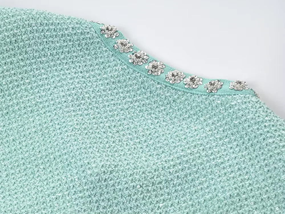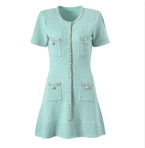 Custom-Made Mint Green Knitted Dress French Style High-End Sweater Dress Pleated Short Sleeves Button Eco-Friendly Natural